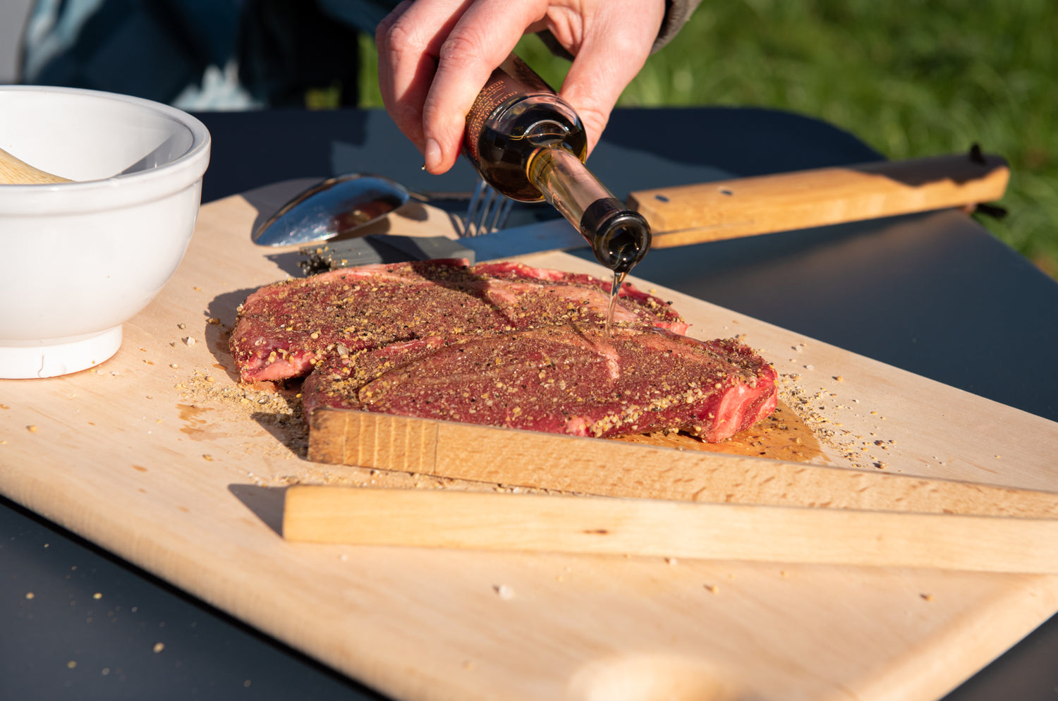 Step 2: Cover the marinated meat with oil (on both sides). Place on the grill rack and grill the meat inside the Outdooroven over briskets or hot charcoal as you would with a normal barbecue. Grill for 5 minutes for a medium bake and flip hallway through. Take out the meat and leave to rest for 5 minutes, covered by tin foil.